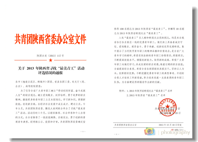 據(jù)了解,為了引導廣大青年員工樹立“勞動創(chuàng)造財富、奮斗成就人生”的職業(yè)觀念,樹立愛崗敬業(yè)、刻苦鉆研、勇于追夢的職業(yè)精神,激勵更多的青年員工立足本職崗位,創(chuàng)新發(fā)展,去年5月開始,共青團陜西省委、騰訊大秦網(wǎng)聯(lián)合舉辦了尋找“最美青工”活動。活動歷時六個月,以組織推薦、社會舉薦和個人自薦的方式,在全省推薦了一批技能嫻熟、業(yè)績突出、勇于創(chuàng)新的普通青年典型。經(jīng)網(wǎng)絡公示、投票和評審,最終確定了10名特別關注“最美青工”和100名陜西省“最美青工”,黃亞光同學榮獲“最美青工”和特別關注“最美青工”兩項榮譽。